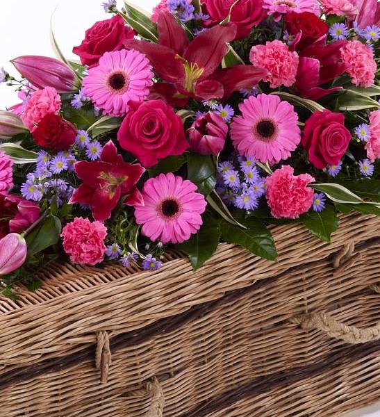 This bright casket spray feautring a classic selection of flowers in pink, red and lilac includes large-headed Rose, carnations, Gerbera and Oriental Lily complemented by luxurious foliages. Approximate height 122cm (4ft).