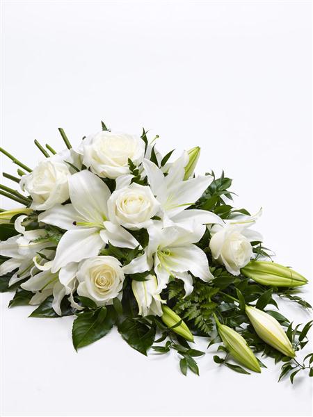 Aralia leaves and French ruscus are nestled amongst classic white Oriental Lily and white large-headed roses in this classic teardrop spray.