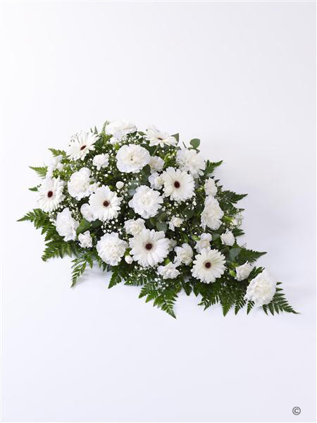 Fresh carnations, spray carnations, germini and gypsophilia, all in pristine white, are beautifully arranged in a teardrop shaped spray. We’ve added dark green leather leaf and fragrant eucalyptus to finish this graceful tribute.