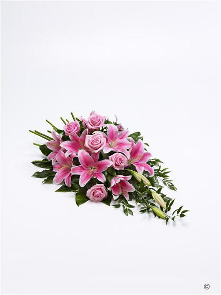 Aralia leaves and French ruscus are nestled amongst classic pink Oriental Lily and pink large-headed roses in this classic teardrop spray.