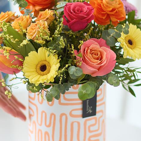 A cute little hatbox filled with fresh bright flowers, expertly arranged by a local florist.