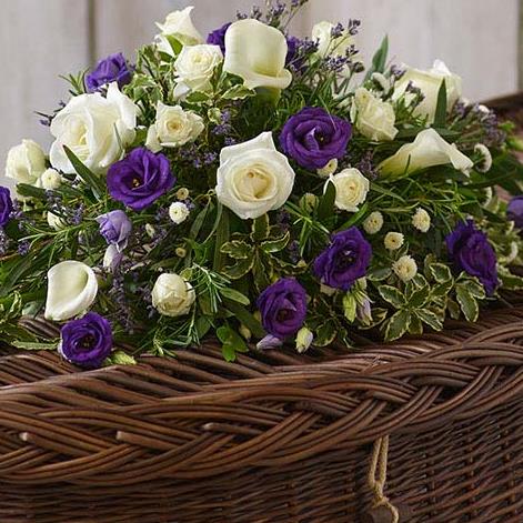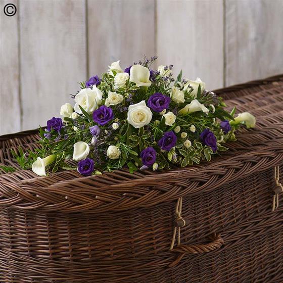 Elegant blooms, including roses and chrysanthemums, contrast with lush foliage in this small casket spray.