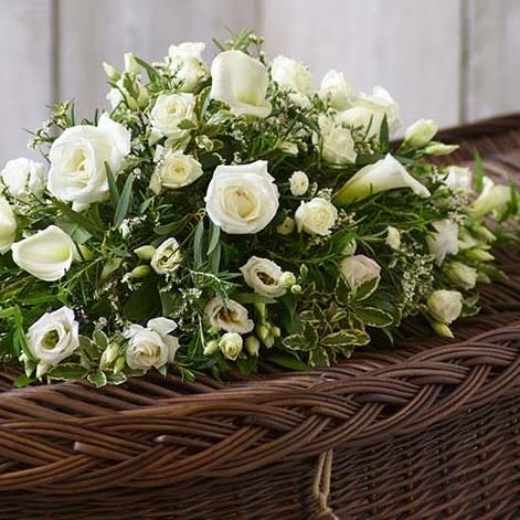 Elegant blooms, including roses and chrysanthemums, contrast with lush foliage in this small casket spray.