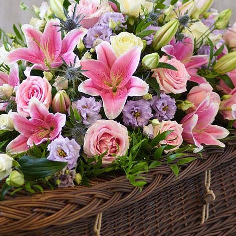 One of our most popular designs, this casket spray is a profusion of pastel blooms including pink and ivory roses and pink oriental lilies.
